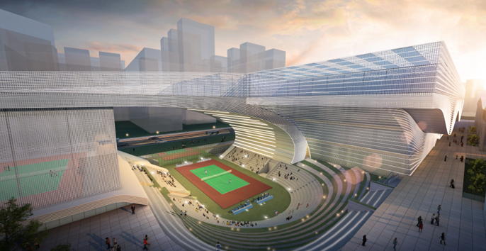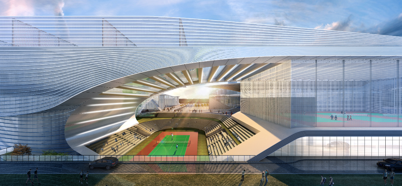 寶安體育中心云館位于深圳市寶安區體育中心地塊內,東側臨體育中心綜合訓練館,南鄰體育中心游泳場館,西臨體育館,北鄰羅田路。項目總用地面積21000㎡,總建筑面積60600㎡,地上3層,限高24m。要求其功能設置需要擁有室外網球場,并且可滿足國家級比賽要求,并配有其它多功能體育館。