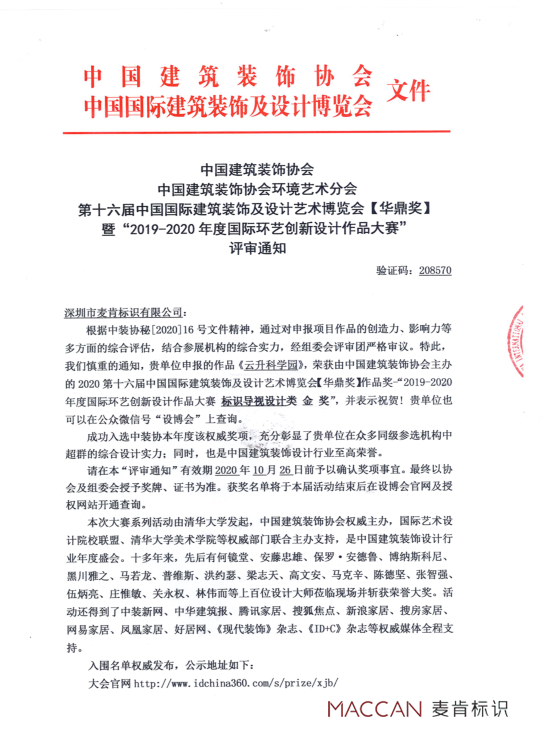 第十六屆設博會【華鼎獎】,麥肯標識從國內(nèi)外數(shù)千套優(yōu)秀作品中脫穎而出,【云升科學園】項目被評選為2019-2020年度國際環(huán)藝創(chuàng)新作品獎金獎。