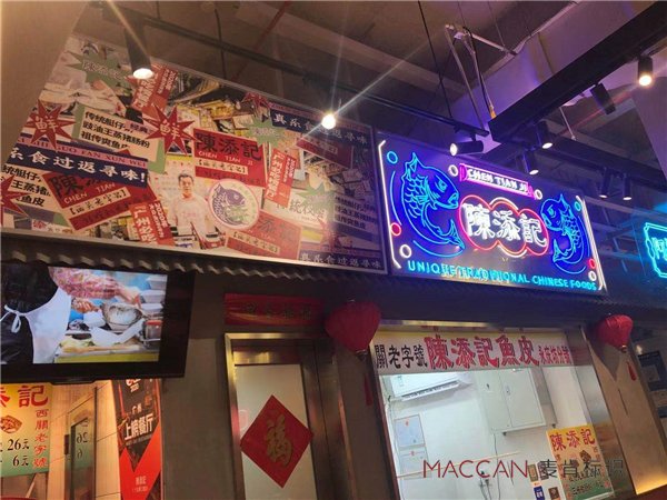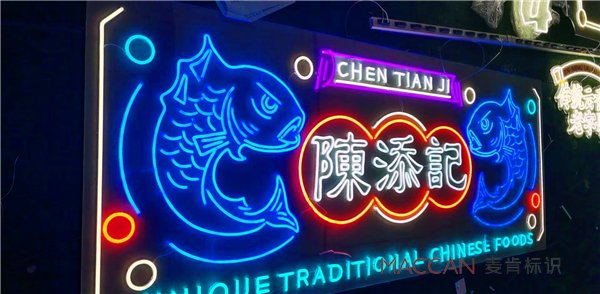 麥肯打造的陳添記霓虹店招,高明度的色彩具有很強的視覺沖擊力,時髦又復古,遠遠就能被吸引。