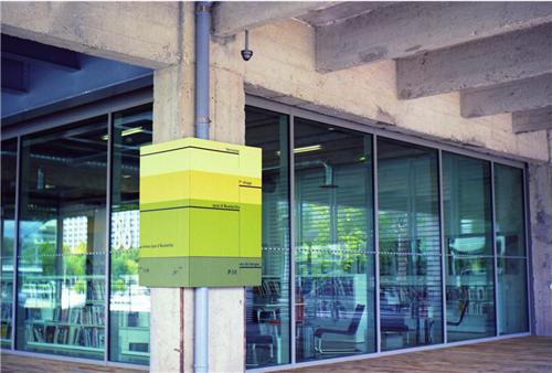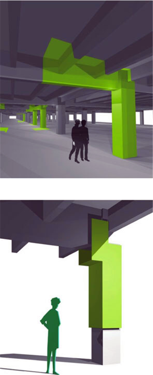 這個導視系統的設計與以往不同的是,設計的載體不能妨礙人們散步或休閑。系統中采用綠色作為主色調,新選用的顏色在視覺上與建筑主體要有主次之分,也要考慮到與建筑主體本身的水泥相協調。
