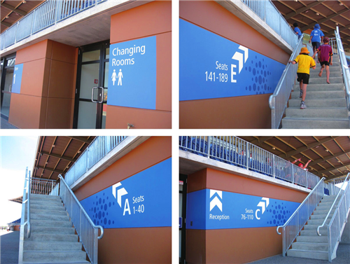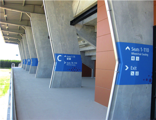 Grandstand可以說是體育公園建筑中少有的帶有導視系統的公園。導視系統中的色彩運用恰當,可以保持長時間的色彩光澤,即使在長時間的使用下仍然保持光亮。