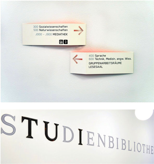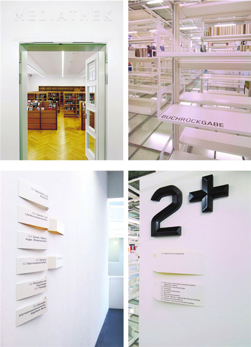 圖書館的導視系統應該使用大型的字體設計,利用明亮的顏色等夸張的設計手法來提示讀者準確的位置。