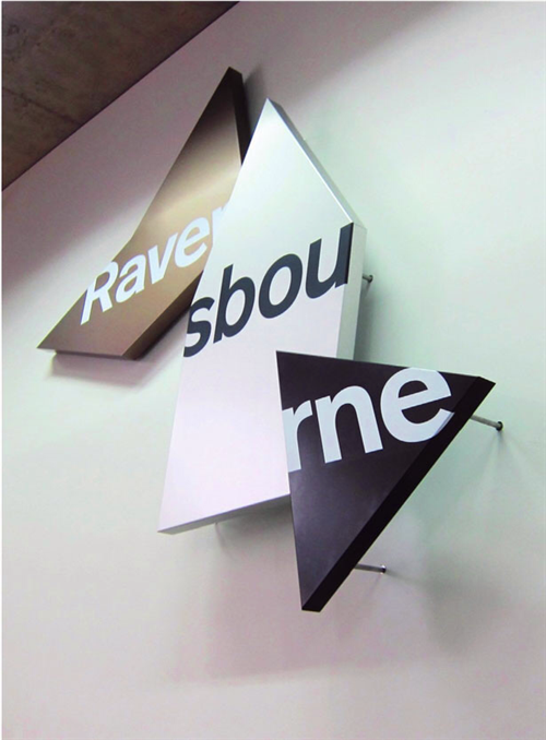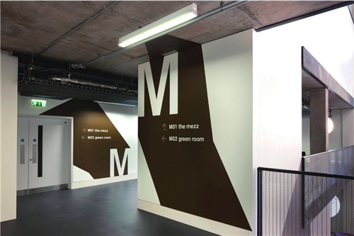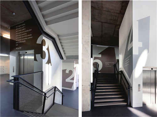 瑞文斯博藝術與傳播學院的建筑內飾是錯層式的20世紀60年代的停車場風格,學院邀請了設計師Johnson Banks對室內導視系統進行設計指導。
