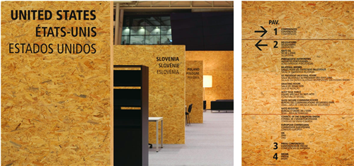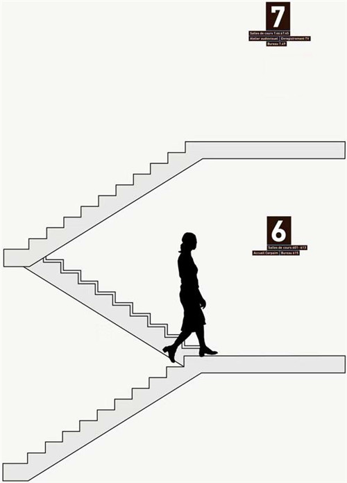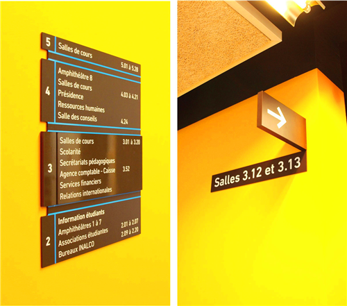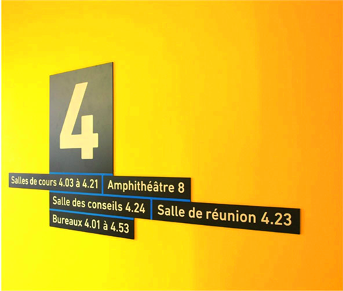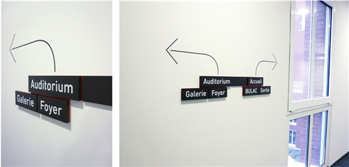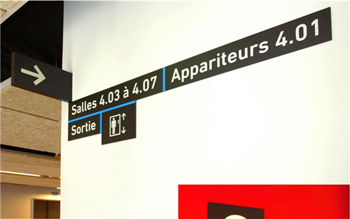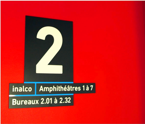 導(dǎo)視系統(tǒng)的視覺設(shè)計(jì)反映了這兩個(gè)功能區(qū)域的特色,而且建筑物的瓷磚就是一個(gè)很好的例子,一邊是米黃色,一邊是白色。設(shè)計(jì)師在大堂內(nèi)部設(shè)計(jì)了一個(gè)導(dǎo)視的十字裝置,用以區(qū)分BULAC和INALCO區(qū)域,它告訴游客主要的方向和大樓內(nèi)部的功能區(qū)域。