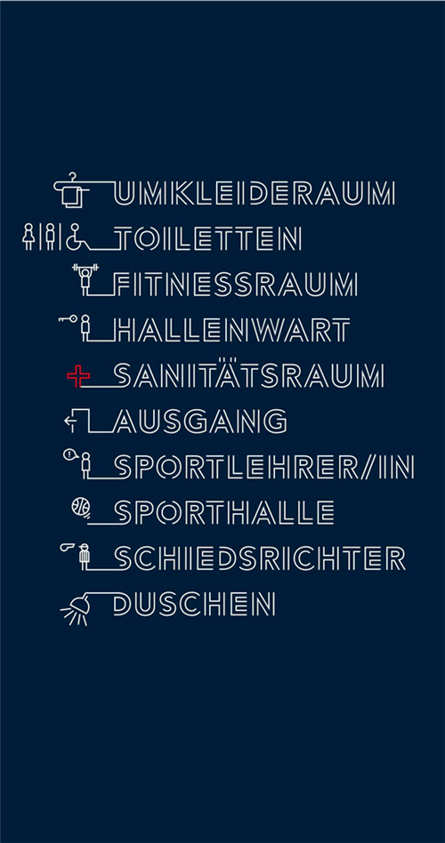 導(dǎo)視系統(tǒng)中最出眾的設(shè)計(jì)就是對(duì)字母的改造,將字母做一個(gè)設(shè)計(jì)的斷層,讓這個(gè)空間帶有運(yùn)動(dòng)的干練、直爽感,線條表達(dá)讓字體與圖案相結(jié)合,讓人感覺到運(yùn)動(dòng)的快樂。
