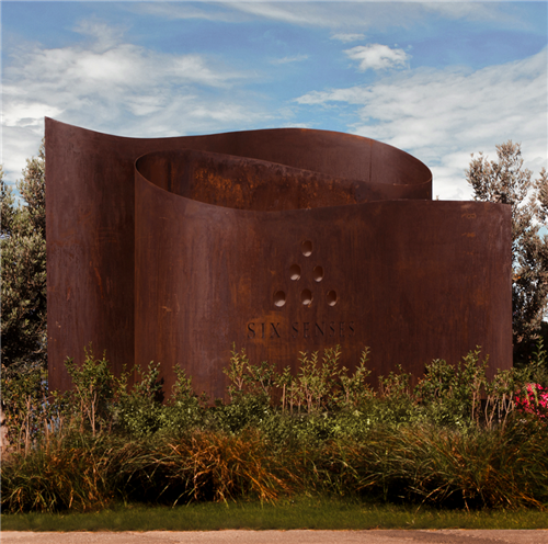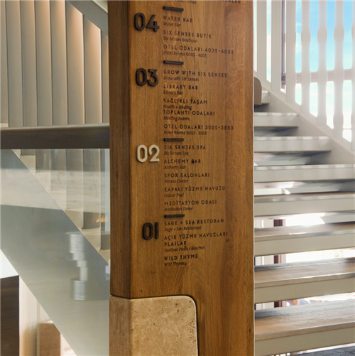 基于酒店名Six Senses,Federation設計機構設計了六個簡約的不規則圓點logo,象征著六種感覺。精神堡壘為流暢的立體折面,在內部設計了藍色的氛圍燈光,具有神秘感。戶外立式導視板由不規則木材和石材結合,擁有彎曲的線條,特別的是,在連接處設計了燈光照明,具有裝飾作用。室內采用較厚的圓角方形木材和石材相結合,具有厚重感,配色溫和,打造了優雅的酒店環境。