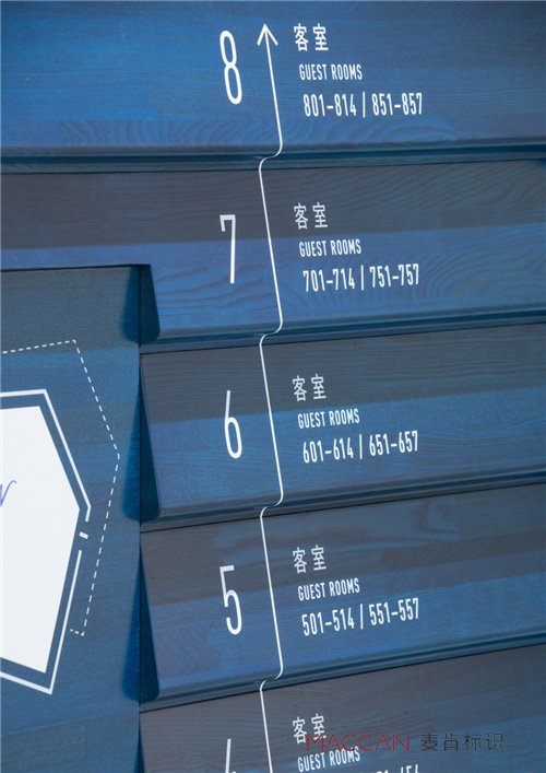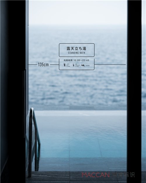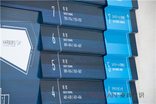 這套導視是日本Hokkyok設計工作室辦為Atami Bay Resort Korakuen度假村設計,該導視系統采用貼墻式波浪型造型表現,使用白色和海藍色做搭配,使用顏色來做功能空間的區分,使空間界限一目了然。
