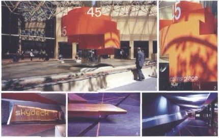 尤里卡摩天臺位于澳大利亞墨爾本,同由埃默里工作室于2006 年設計,它是一個空中主題公園,其展覽是一次多重感官體驗。公園中,動態的條狀文字與傾斜的地面融為一體,不和諧的聲音結合動態的圖像立刻激活了空間環境,使得參觀者將注意力聚焦于此。環繞在電梯四周墻壁上的一條條成滾動狀的方字信息傳達著這座城市迷離朦朧、光怪陸離的元素,同時成流線形狀的信息片段隨著參觀者的移動而變化,還能為參觀者指示各個備受青睞的地點。設計方將各種音響效果、多種互動投影、傾斜的地面和多個系列的動態視頻鏡頭匯聚在一起,刺激著參觀者的感官,帶給參觀者身臨其境的感受。