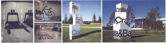 由卡洛里· 范登- 埃恩登設計工作室(Calori & Vanden-Eynden)于2006 年設計的科瑞特和巴羅(Crate & Barrel)家具世界總部包裝非常著名,上面有縱貫全身的字母標志,公司全球總部的標志項目即從包裝中獲取靈感,起到了積極宣傳公司獨特品牌形象的作用。采用巨大的立方體作為建筑地點的重要標志,線條干凈,形態簡潔,回應了總部建筑特色。極富沖擊力的黑色印刷字體置于干凈的白色環境中,輔以淺灰色的背景圖像,反映出科瑞特和巴羅的家具設計簡單準確的特色。通過變換其位置和大小,這些簡單的立方體趣味盎然又不失含蓄,內部標志方案構成總體路標系統的大部分。