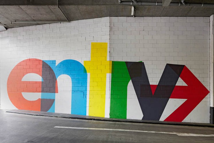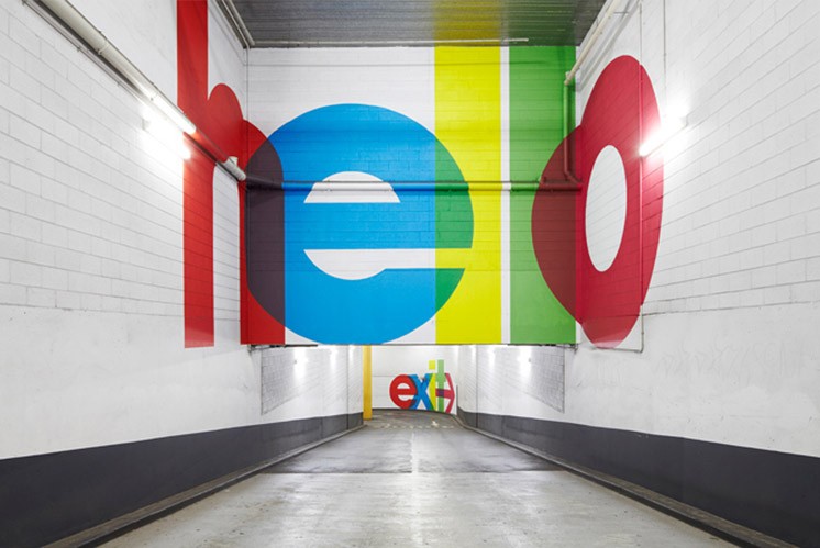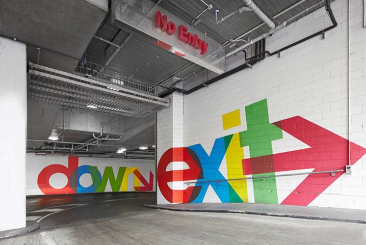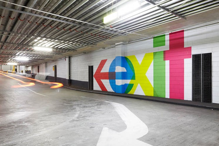 在墨爾本QV商業地下停車場項目,其標識導視系統采用了一系列大規模的環境圖形來延續該商業項目整體VI形象,且該導視設計從早期現代主義平面設計找到靈感,并用既環保設計手法噴涂來實現指示功能,文字采用了彩色疊加的方法讓地下停車場相對封閉的空間變得大氣而有藝術感。