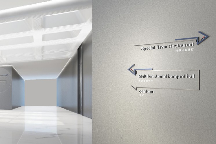 同時(shí),隨處可見的纖細(xì)的立體箭頭指引,被應(yīng)用到公共視覺系統(tǒng)中,采用透空漏景的結(jié)構(gòu)方式是為了最大限度減弱裝置對景致的干擾,如線條一般恰到好處地與空間融為一體,既遵循了統(tǒng)一性原則,引入了智慧園區(qū)的理念,又能自然吸引眼球,力求成為建筑物的和諧細(xì)部。