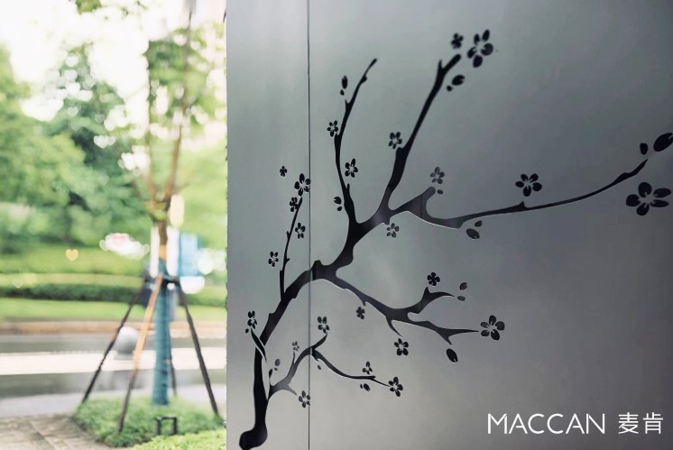 入口處“梅蘭竹菊”四君子導視標識在設計上借用黃公望先生的理念,采用傳統的藝術創作手法——鏤空雕刻,在光照下的投影有著奇妙的暈光效果,光感柔和且暈光均勻,將自然美、建筑美、人文美有機融合,似山水無言,向往不止,自在由心,步履不停。