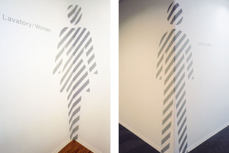導(dǎo)視設(shè)計(jì)師以“孵化”為主題,設(shè)計(jì)了以女學(xué)生為基礎(chǔ)展開(kāi)的一系列icon,人物的頭部隨著場(chǎng)景變化而變化,使整體環(huán)境形成一致性。除了房間名稱(chēng)和標(biāo)志外,icon被放大作為環(huán)境圖形在公共場(chǎng)所自由出現(xiàn),均使用淡灰色斜條紋打造陰影效果。整套導(dǎo)視系統(tǒng)使用黑白灰的配色,打造了一個(gè)干凈整潔的空間。