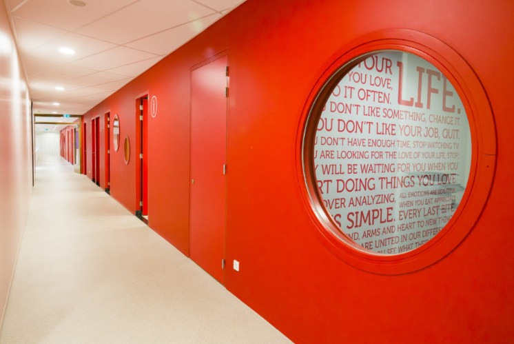 Krimpenerwaard學(xué)院 標(biāo)識(shí)系統(tǒng)設(shè)計(jì)與內(nèi)壁的圓形窗戶(hù)相呼應(yīng)