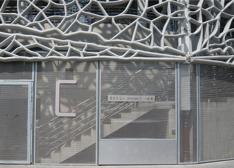 基于體育場銀色外觀,Béatrice Fichet采用銀色深藍色為主要配色,玫紅色作為輔助色,標牌采用鏤空和噴漆的形式。特別的是,字體設計較為圓潤,字體的不規則感與建筑外墻相呼應,采用非水平的排版,使得每個數字具有獨特性,整套導視系統信息傳達度較好。
