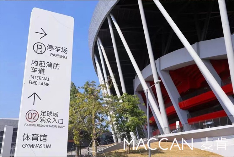 肇慶新區體育中心,位于廣東肇慶,是一個囊括體育館、訓練館、專業足球場、足球公園(含服務中心、2個人造草足球場、6個籃球場、4個網球場)等多功能的大型體育場,體育館標識導視系統由麥肯設計負責設計實施。