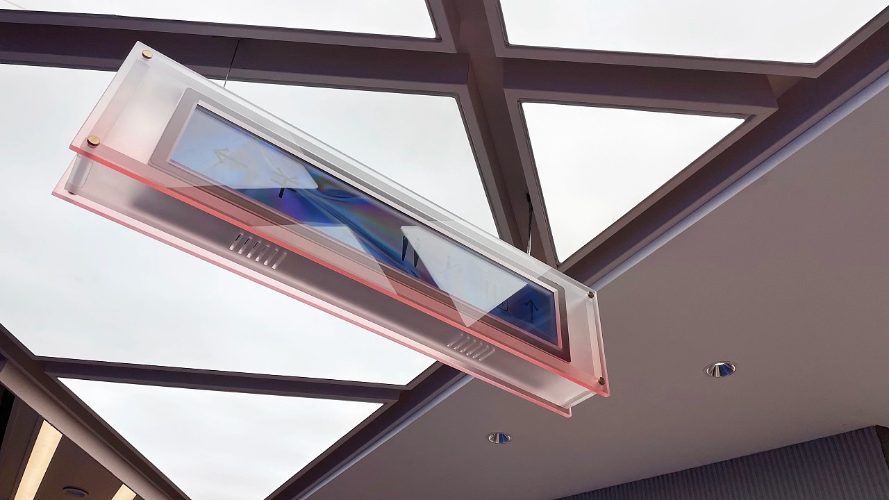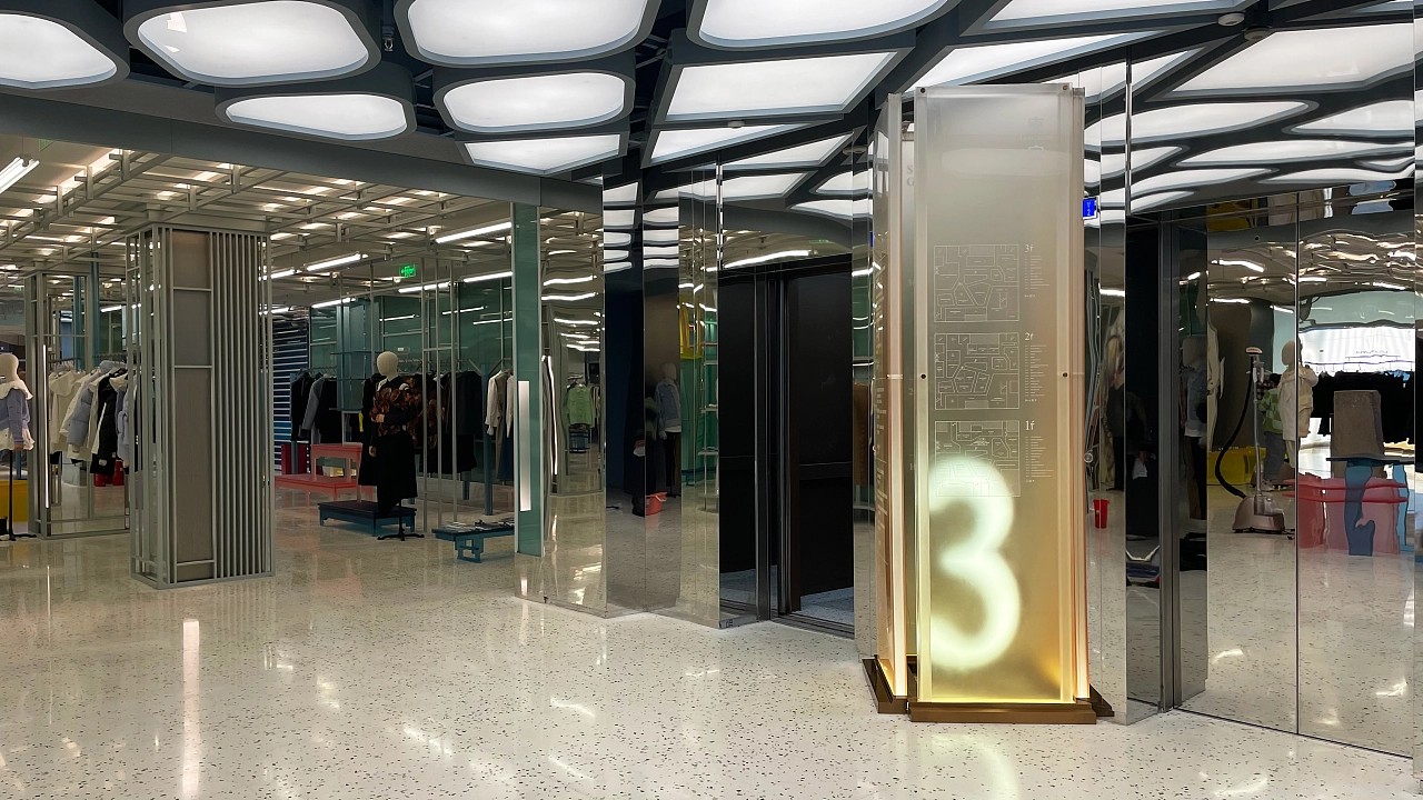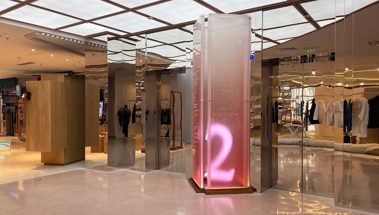 這次整體提質升級,轉型為全球時尚買手制百貨。全新的空間理念,進行導視系統的創作與創新。簡化榫卯結構,與新型材質的結合,用現代的材質與表現手法來詮釋未來中式與現代元素的結合。懸掛式導視應用了動態圖標,更為空間添加了時尚和未來感。根據空間關系,采用顏色區分樓層。地板是水磨石的緣故,調整了落地式的固定方式,增加了玫瑰金底蓋,同時把榫卯插銷也加了玫瑰金蓋帽,與空間材質先呼應。