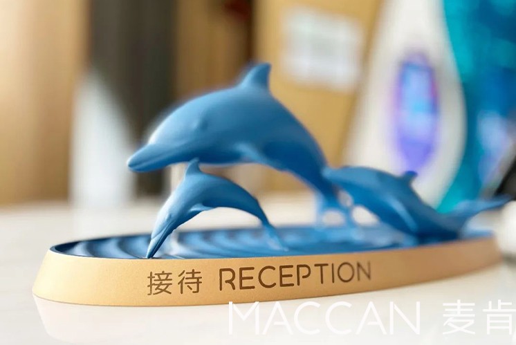 海豚標識造型以大海深藍為主色調,擁有特征鮮明的外光輪廓,圓潤飽滿的線條,海豚越出水面的身體,矯健有力,極具辨識度和未來感,突出人與自然交融共生的理念,融入了多種看得見的“海平面”、“水波紋”等海洋元素,讓人為之眼前一亮。