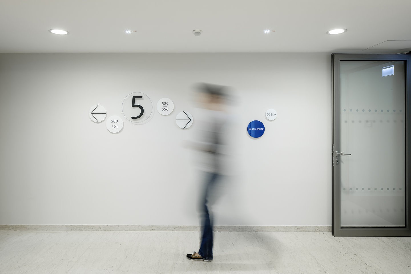 基于DGUV總部的內飾,Moniteurs使用高質量的玻璃作為標牌材料,與企業形象高度融合。采用藍色、黑色和白色的配色,與品牌配色相統一,圓形的標牌也與logo相契合,整套導視系統使品牌形象深入人心,富有個性且具有品牌效應,標識牌也變得靈動優雅起來。