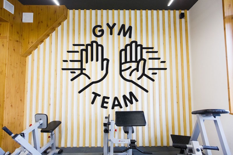 GYM TEAM健身俱樂部內部空間舒適明亮,Zernaev Studio針對其提倡的合作精神設計了擊掌的logo,導視系統貫穿了手這一元素,設計了一系列手勢來傳達信息,營造了積極友好的氛圍。在更衣室增添了標語,增加了趣味性。