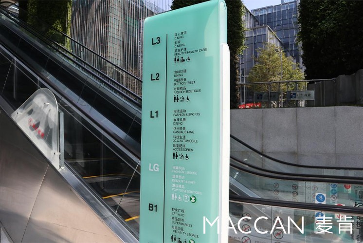 麥肯標識結合龍崗仁恒的標志元素,色彩斑斕的顏色是商超活躍元素的動人音符,映入眼簾的綠色光彩溢目,清晰導視符號指引著人們,有著現代規整劃一的時尚元素,也是靈動盎然的明亮藝術裝置。麥肯設計師們用綠色貫穿整個商業導視空間,根據概念方案,配合落地實施服務,打造和諧的“人場物”的商業化氛圍氣息。