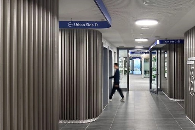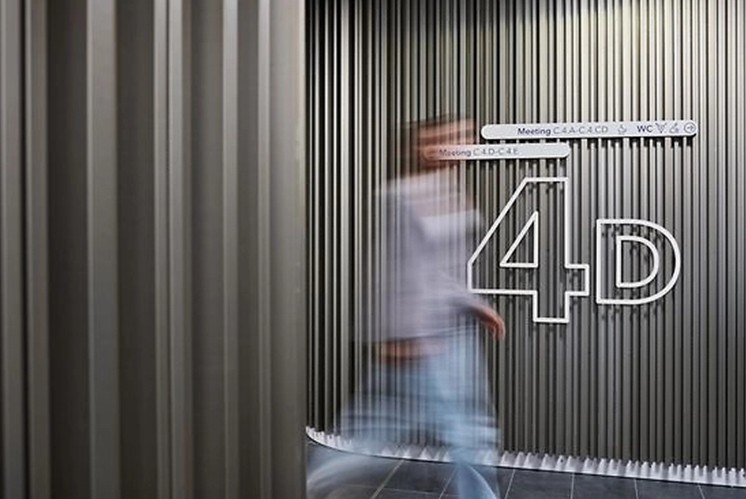 if團隊受委托為這一建筑群設計導視系統,他們的設計理念深深植根于建筑本身的語言之中。建筑立面上那些動感十足的曲線和網格,塑造了森肯堡區的視覺形象,也成為了if團隊設計導視系統時的靈感來源。巧妙將這些建筑元素轉化為導視系統中的設計語言,通過垂直的板條和水平的線條網格系統,構建了一個清晰而富有節奏感的導航環境。