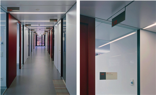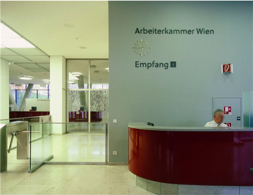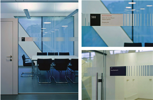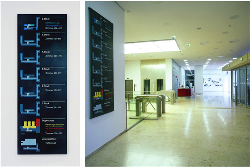 在大樓的導視系統中,另外一個很重要的特點就是在現代的設計中,仍能體現出大樓的歷史特點,這些體現在對AK大樓特別選用的材料及字體設計。整個系統的Soleil字體包括符號和大小寫字母等都是與專業字體設計師Wolfgang Homola合作的設計作品。