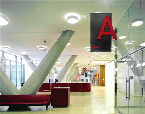 銀行與商務行業往往有著干練、嚴謹、細致的行業特征。專業性決定品牌形象與品牌特征都需要明確的導視系統,才能讓客戶在進行金融服務或商業活動時感受到品牌的文化特色,讓客戶在服務的過程中感受到品牌的文化內涵??梢哉f,企業辦公導視系統的品牌表現特征最為明顯。