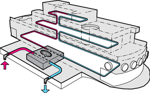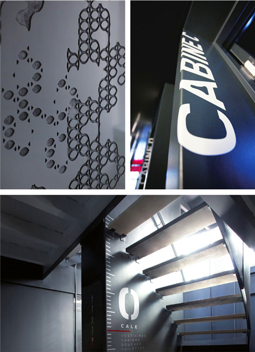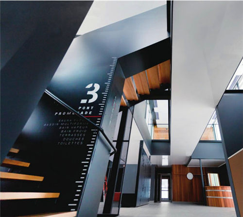 建筑物的內部幾乎以全黑和深灰為主色調,這種設計給人的第一感覺是壓抑,這一點與人們認識的傳統水療機構有比較大的差別,這樣強烈的對比卻能讓客戶沉醉在寧靜而冥想的空間里,更好地享受水療。