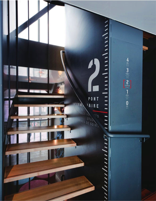 除了考慮到設計美感方面如何與建筑主體相呼應以外,最重要的一個因素就是導視系統覆蓋的范圍,包括配備3部獨立電梯的13個樓層,以及采光通風的中庭。