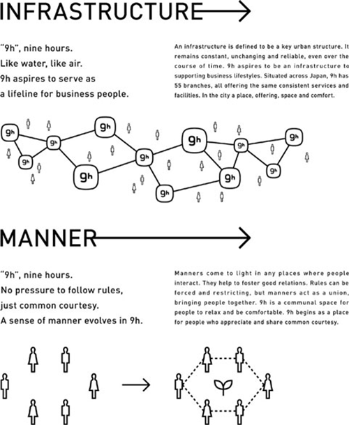 9h nine hours是一個具有強烈品牌創意的地方。9H代表了他們提倡的生活理念就是1小時的梳洗、7小時的基本睡眠時間,以及1套干凈的衣服。