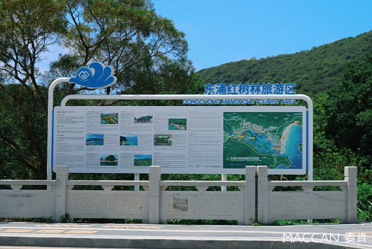 沿著蜿蜒的棧道前行,山的輪廓在遠(yuǎn)處勾勒出一幅水墨畫卷,翠綠的山巒與湛藍(lán)的天空相互映襯,是大自然最精致的筆觸。海洋碧波蕩漾,無盡的寧靜與悠遠(yuǎn)之意趣。導(dǎo)視牌上的文字,如同山與海的低語,講述著紅樹林的生態(tài)奧秘、歷史變遷以及人與自然的和諧狀態(tài)。東涌紅樹林濕地景區(qū)的導(dǎo)視牌以其絢麗多彩的設(shè)計(jì),完美融入自然的懷抱。它們或立于濕地的邊緣,或置于山林的幽徑,讓游客在漫步中領(lǐng)略到山的巍峨、海的浩瀚,為山海之約增添了詩意與浪漫。導(dǎo)視牌的設(shè)計(jì)提取了地域特征屬性作為元素基礎(chǔ)。波浪的曲線、貝殼的紋理、珊瑚的枝丫,這些自然元素被巧妙地融入導(dǎo)視牌的設(shè)計(jì)之中,打造出一個(gè)充滿趣味與互動(dòng)性的標(biāo)識(shí)系統(tǒng)。碧海潮生引夢(mèng)回,珊瑚枝上月華開。浪涌千層書海韻,沙留萬點(diǎn)記潮來。這些詩句不僅描繪了濕地的美景,也體現(xiàn)了導(dǎo)視牌的設(shè)計(jì)理念。
