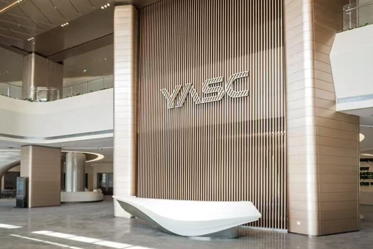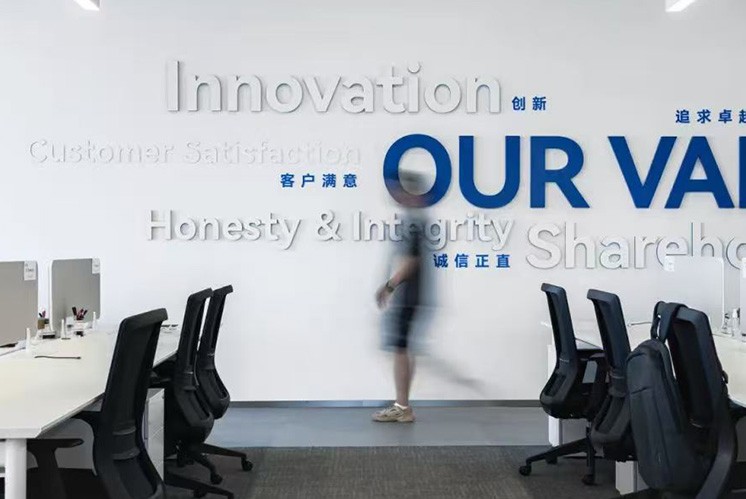 長飛半導體園區的每一處空間都蘊含著獨特的文化與創意,而文化墻更是這片科技圣地的靈魂之窗。采用高級地毯材料打造的文化墻,以藍色與綠色為主色調,巧妙地將科技的冷峻與自然的生機完美融合,讓訪客在感受園區獨特的藝術魅力的同時,也能領略到創新精神的內涵。文化墻以深邃的藍色為底色,仿佛無垠的宇宙星空,象征著科技的無限可能與探索的勇氣。其間的翠綠色,則如同生機盎然的綠洲,代表著創新的活力與希望。兩者相互交織,是對生態與和諧的深刻理解。選用的織棉材料,質地柔軟而富有彈性,觸感溫潤如玉。在視覺上營造出一種柔和而高級的氛圍,紋理細膩,仿佛細膩的織錦,彰顯了園區文化的深度與溫度。
