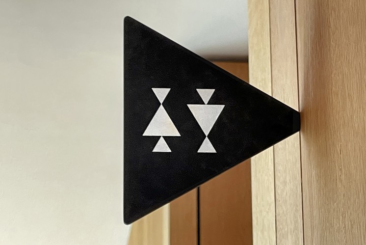漫步于FUKUTAKE TRES,三角形的導視元素以一種精妙的韻律感滲透在空間的每個角落。它們或優雅地佇立在路徑轉折處,或輕盈地懸浮于素凈的墻面上,甚至巧妙地嵌入地面鋪裝。這些標識絕非孤立存在,其簡潔有力的形態與建筑立面的三角輪廓、窗戶的幾何分割線、乃至庭院中精心布置的景觀元素,都進行著無聲卻默契的形態對話。這種從宏觀建筑尺度到微觀標識細節所貫穿的系統性三角語言,構筑出一種高度和諧統一的沉浸式藝術體驗。視覺上的純粹與秩序,不僅有效地引導著參觀流線,更在無形中放大了空間本身的結構美感與藝術氛圍。