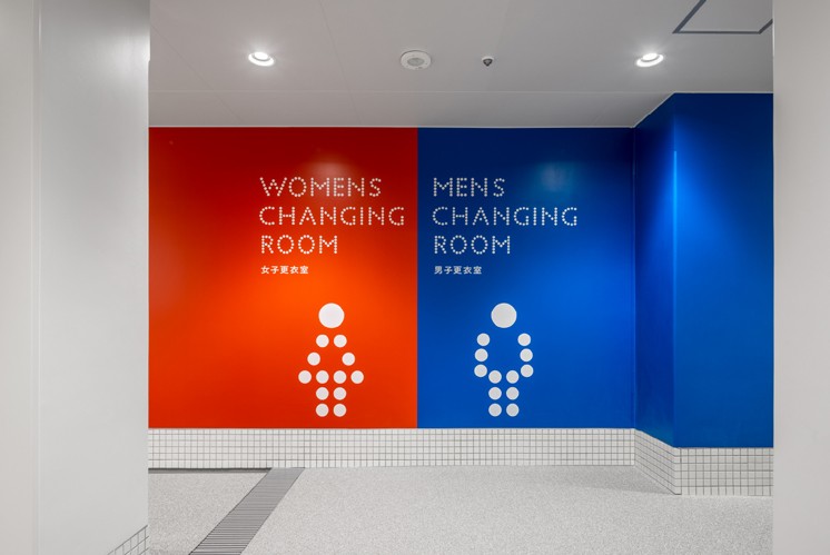 設計深諳色彩傳遞情緒與信息的力量。如男女更衣室標識,鮮明的紅色與藍色形成強烈視覺對比,快速區分功能區域,契合運動場所高效、直接的空間使用需求。黑色標識在建筑灰色、場地淺色調背景下,憑借沉穩厚重的視覺感,成為信息承載的可靠載體,既保證可讀性,又與運動空間的現代感相呼應 。