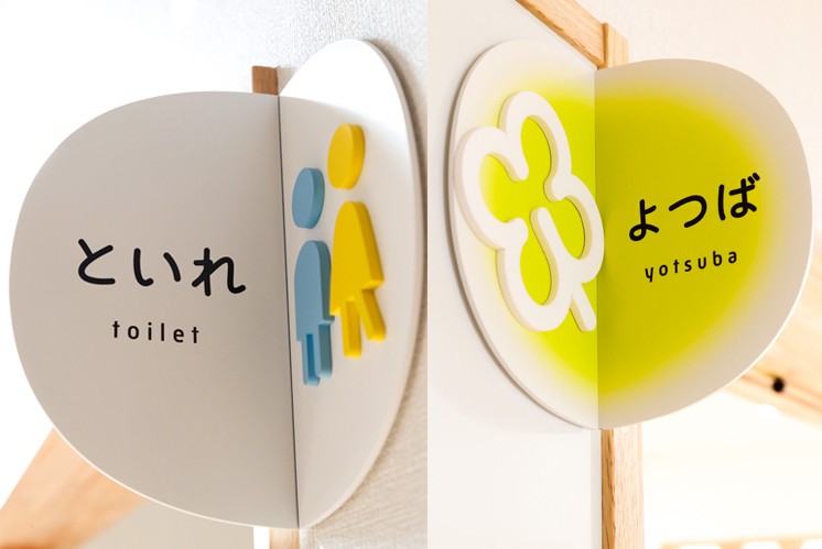廁所標識采用心形的開合式設計,將代表男女的小人形象和 “toilet” 英文標識巧妙融入其中,可愛且直觀,便于幼兒識別。而其他標識牌的形狀也并非傳統的規整矩形,多帶有圓潤的邊角或獨特的外形輪廓,這種形態設計契合了幼兒天真爛漫的特質,不會給人過于嚴肅、生硬的感覺。