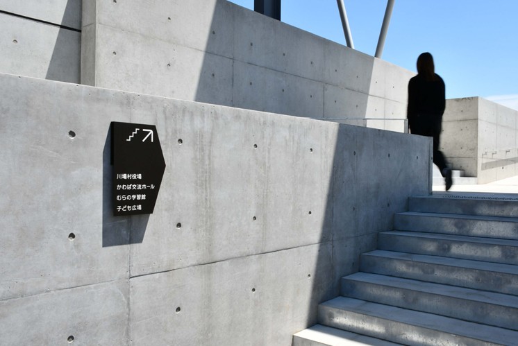 標識形態融合政府辦公樓(役場)形象與周圍山巒輪廓,巧妙勾勒出地域特色。戶外導視牌的獨特造型,似山巒起伏,又暗含建筑秩序,與基地外的自然山景、建筑空間渾然一體。行走在基地中,墻面、欄桿上的標識大小適中、位置恰當,箭頭與文字指引清晰,既滿足功能性,又因形態設計,讓觀者在獲取信息時,能感受到自然與人文融合的韻律,仿佛每一塊標識都是自然山巒與產業建筑的微觀縮影,串聯起空間的同時,也串聯起川場的過去與當下 。