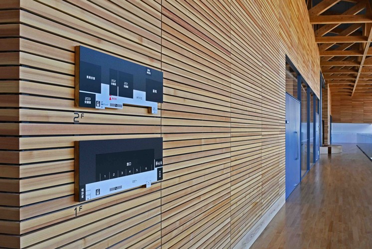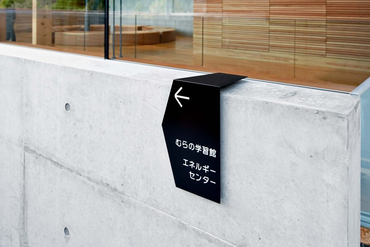 標識顏色以黑色為主調,沉穩且具質感,與基地建筑中混凝土的質樸、木材的溫暖形成呼應。黑色標識鑲嵌于清水混凝土墻、矗立在戶外場地,在明亮的自然光線與簡潔的建筑環境襯托下,既不喧賓奪主,又清晰傳遞信息,如同林業產業歷經歲月沉淀的厚重底蘊,默默訴說著川場村與木材、自然共生的故事 。