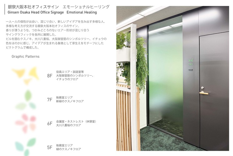 銀泉大阪總部辦公室導視系統《情感療愈》,以 “促進多元人群與思維交流,催生創意新生” 為核心目標,錨定 “縹緲香氣” 的靈感與 “新生萌芽” 的主題,通過色彩、形態與空間觀感的精妙設計,將 “療愈感” 深度融入辦公導視的功能性與藝術性中。