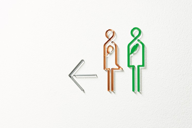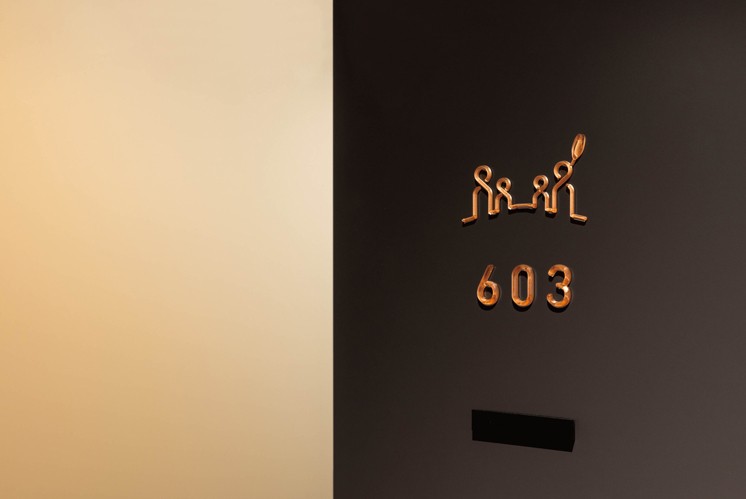 形態設計是 “新生” 主題的具象化表達。核心視覺采用 “空氣感混合圖形”,以模糊、輕盈的邊緣模擬香氣的無界彌散,讓圖形如氣息般縈繞空間,弱化導視的 “指令感”。同時,“萌芽” 象形圖標貫穿系統:衛生間標識里,女性符號似嫩芽蜷曲,男性符號伴葉片舒展,將 “創意萌芽” 的隱喻嵌入功能標識;房間標識 “603” ,以連貫線條勾勒出類似人群互動或萌芽生長的形態,線條靈動且保有空氣感,讓形態成為 “交流” 與 “新生” 的視覺符號。