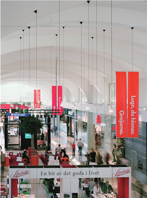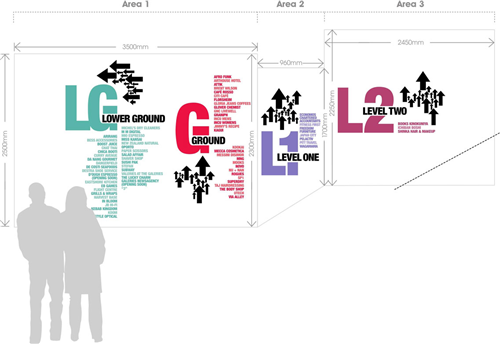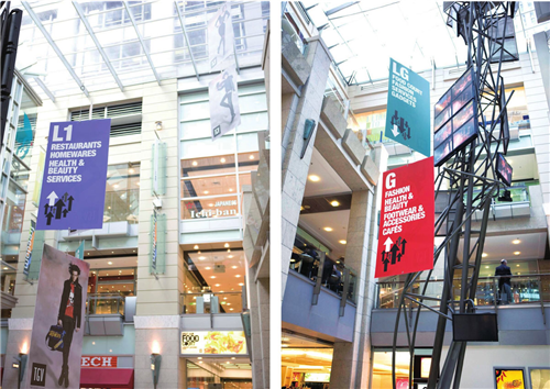 Galeries的導(dǎo)視系統(tǒng)設(shè)計(jì)有兩個(gè)目的:一是基本的導(dǎo)視系統(tǒng)功能,起到指引顧客行走方向的目的,不至于讓人們?cè)谫徫锏倪^程中迷路;二是讓人們感受到一定的商業(yè)氛圍。