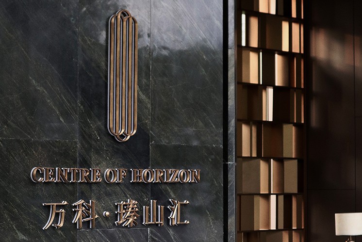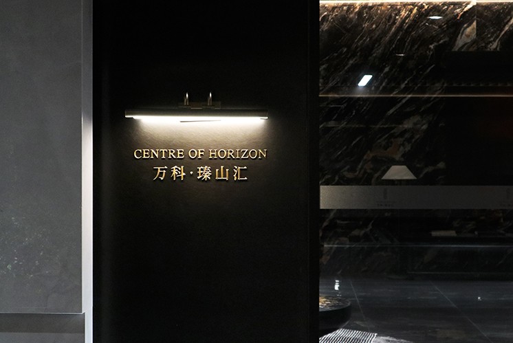 主入口處項目標識“萬科?瑧山匯” 的立體字嵌入深色大理石墻面,暖調金屬光澤與冷冽石材形成強烈對比,光線照射下折射出豐富光影,恰似黃旗山景的沉穩與住宅奢華感的碰撞。