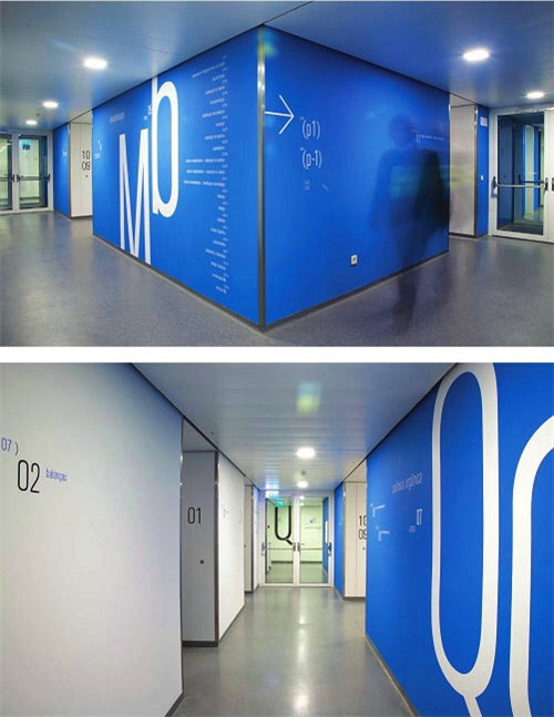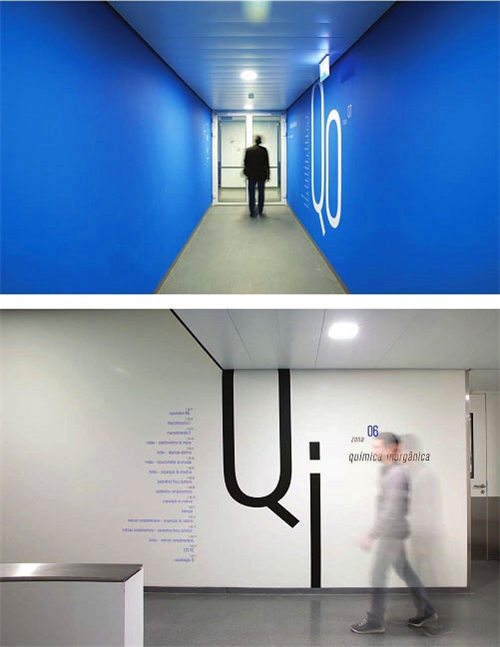 葡萄牙設計公司“P-06 ATELIER”與建筑公司“Goncalo Byrne”合作完成了該辦公空間的導視系統設計。通過縮減名字和夸大字母大小對比的方法,把化學方程式的圖案應用在導視設計中。在墻面、地板上大塊區域內大規模地應用這種手法,更便于來訪者的遠距離閱讀。