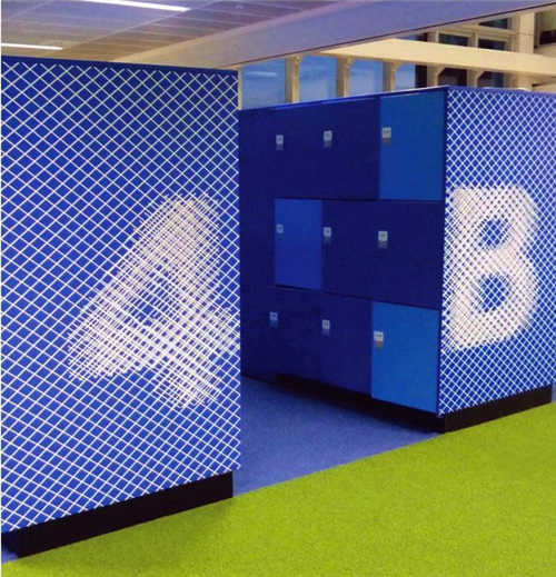 此外,結合整個辦公環境,每個樓層都要有與建筑本身色調相匹配的字體和主色,而且各樓層上標識的位置必須保持一致。此種設計將使空間的視覺效果大為提升。非正式的聚集場所也都擁有自己的獨特標識。各樓層的會議室被命名為“會議帳篷”;“聊天盒”用以命名信件收發室;就連操作室也被用以大膽、有趣的圖形來加以裝飾。