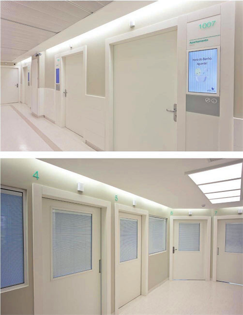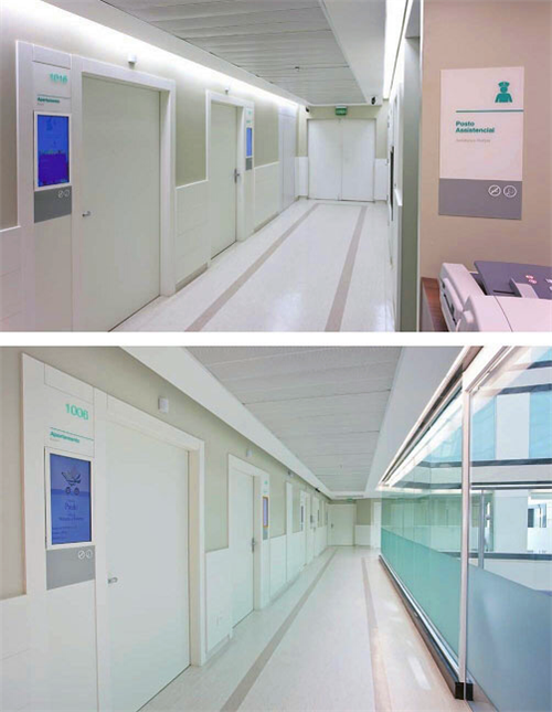 Moinhos de Vento醫院新路標導視系統工程的初期階段是在新產科病房進行的。作為一套獨特新穎的設計體系,其中的信息全是用雙語(葡萄牙語和英語)進行介紹的,而且在所有房間和套房的入口處都裝有高科技LED顯示屏。清爽、大方的設計與醫院的整體環境氛圍十分契合。