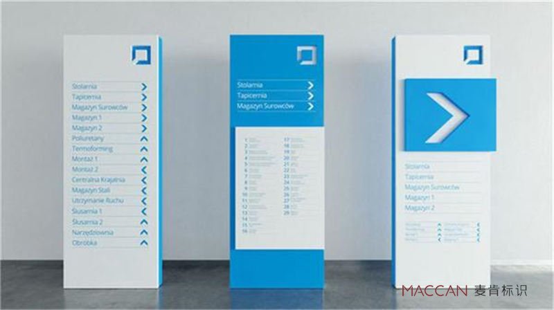 辦公區(qū)域中的落地式分流標識牌主要放置在大堂、廣場、樓梯出口及岔路口等人流較密集的地方,扮演著指示與導向的角色。