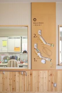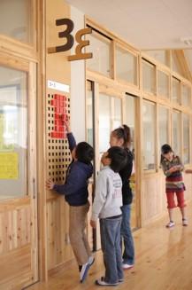 日本基山小學利用自然環(huán)境,將學校建筑材料—木材,與整個導視系統(tǒng)結合,基于木材的原始色彩,配合視覺上很容易理解的的顏色來完成整個導視標識設計與教室的區(qū)分。導視標識牌數(shù)字以積木的形式來完成,學生們自己可以插入積木,根據(jù)他們的班級和學年來調整積木的高度與數(shù)字。整個導視設計希望每個學生每年都能通過這種調整班級積木的形式來增進其對班級學校的熱愛!
