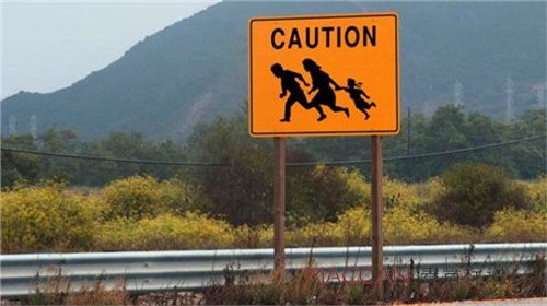 在美國高速公路你可以看到一家三口手牽手拉著跑的街道路邊標識牌,代表的意思是美國有很多非法移民,因為沒有有效身份證,因此你在高速公路上開車,就要注意到這些常常為了躲避檢查而驚慌逃跑的非法移民。