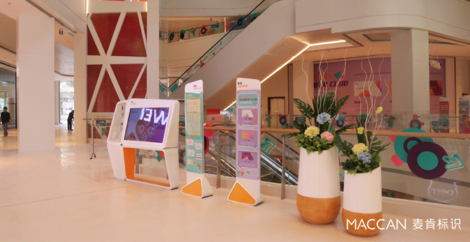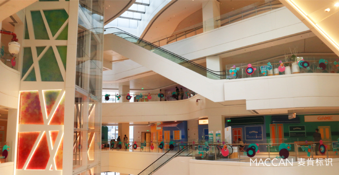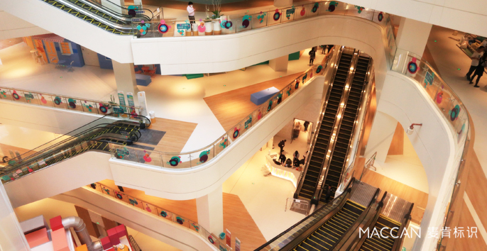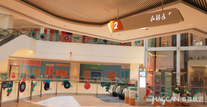 麥肯利用導視信息的碎片平面和合理分配,增加簡潔時尚的設計圖案,將整個區域打造成了休閑放松、愜意漫步的購物空間,極大滿足了消費者的心理。