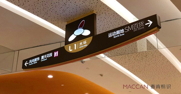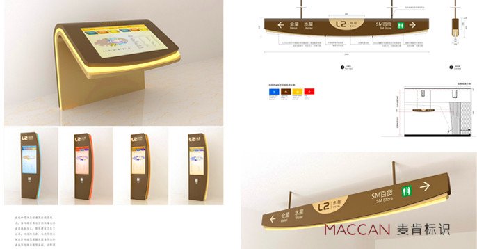 SM天津濱海城市廣場導視系統設計的大小是以環境背景為參照,在設計滿足本質功能的同時,與整體環境協調統一。商場導視系統設計制作材料的質感和肌理對傳達整體環境有著重要的作用,為使人對商場空間環境產生整體的認同感,材料也應與環境本身匹配并有適度的對比。